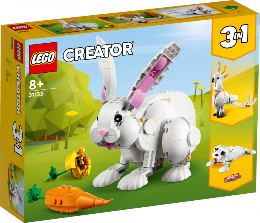 Bērni no 8 gadu vecuma var atveidot aizraujošus stāstus ar fantastisko LEGO® Creator 3in1 rotaļu komplektu "Balts trusis" (31133). Tajā ir iekļauts no klucīšiem būvēts rotaļu trusis ar kustīgu galvu, kājām, muti un ausīm, un tas var izvēlēties 2 gardumus: burkānu vai ziedu.