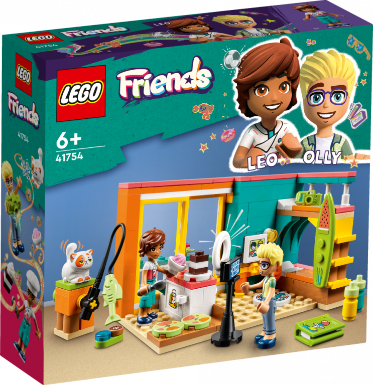 Bērnus no 6 gadu vecuma, kam patīk cepšana, radošas rotaļas vai abas šīs nodarbes, LEGO® Friends būvēšanas rotaļu komplektā "Leo istaba" (41754) gaida neskaitāmi atklājumi. Leo ir iekārtojis studiju savā istabā, lai filmētu saturu savam gardumu cepšanas kanālam. Bērniem patiks darboties kopā ar radošajiem zēniem Leo un Oliju. Olijs lieliski prot filmēt video, tāpēc viņš ir īstais draugs, kas var palīdzēt Leo. Komplektā ir daudz funkciju un piederumu, kas iedvesmos lomu spēlēm, tostarp kaķu rotaļlieta, pavārgrāmata un kamera. Kad filmēšana ir pabeigta, bērni var atvērt balkona durvis, lai draugi varētu aplūkot skaistos jūras skatus no pludmales tematikā iekārtotās bērnistabas.