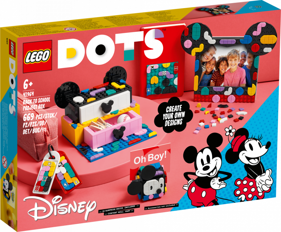 Pasniedz jebkuram rokdarbu cienītājam vai Disney fanam no 6 gadu vecuma dāvanu, par ko rotaļu laukumā runās visi — interesanto LEGO® DOTS ǀ Disney Mikipeles un Minnijas skolas projekta komplektu (41964)! Tajā iekļautas 6 dažādas DOTS pamatnes, tostarp lādīte ar 2 atvilktnēm un Mikipeles ausīm, foto rāmītis, piezīmju turētājs ar slepenu nodalījumu, 2 plakani somas piekariņi un pielīpošs dekors, kā arī daudz elementu (arī 10 elementi ar īpašām Mikipeles un draugu dekorācijām). Bērni var salikt elementus un veidot aizvien jaunus dizainus uz šiem priekšmetiem, brīvi paužot savu individualitāti.