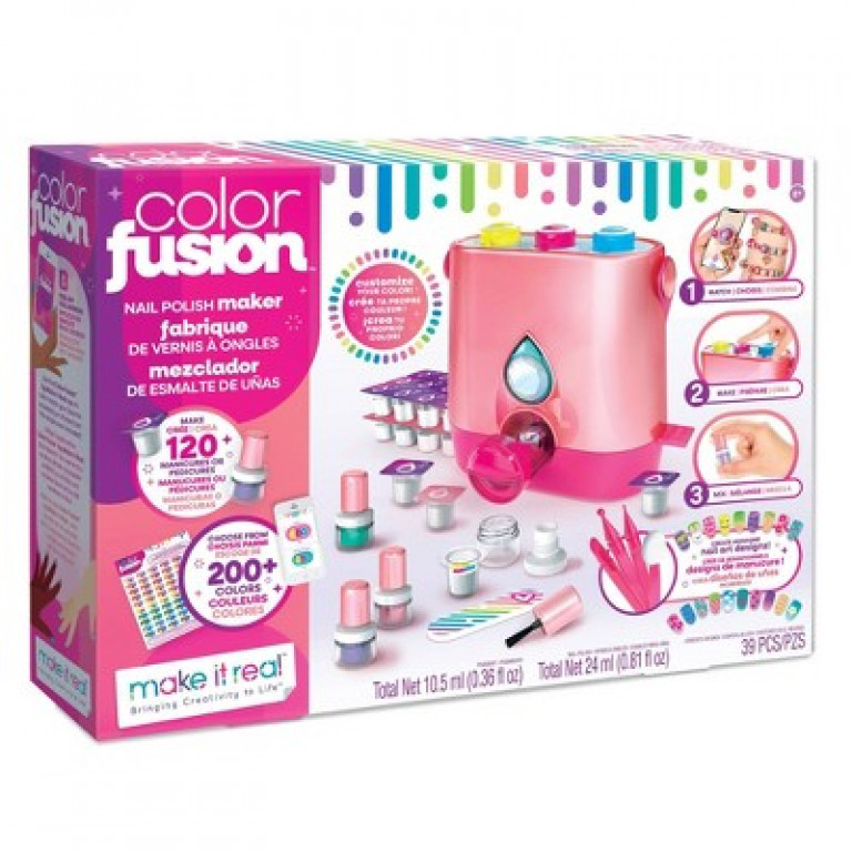 Make It Real ir misija iedvesmot meitenes! Make It Real palīdz dot meitenēm iespēju domāt radoši, izmantojot interaktīvas spēles, veidot viņām ceļu uz radošu karjeru un iedvesmot jaunos māksliniekus īstenot savus sapņus. NAGU LAKA IR TIKPAT UNIKĀLA KĀ JŪS: Izveidojiet pielāgotas nagu lakas krāsas ar Color Fusion nagu lakas veidotāju. Sajauciet vairāk nekā 200 nagu lakas krāsas ar spīdīgu vai mirdzošu pārklājumu. Drošs bērniem. Šajā komplektā izmantota ūdens bāzes nagu lakas formula bez smaržas. Vienkārši soļi: 3 veidi, kā izveidot krāsas. Izvēlieties krāsu no komplektā iekļautās recepšu grāmatiņas vai izmantojiet bezmaksas lietotni krāsu saskaņošanai. Izveidojiet savu krāsu maisījumu. Ievietojiet bāzes kapsulu, iestatiet krāsu formulu. Izņemiet kapsulu, ievietojiet pudelītē, uzskrūvējiet vāciņu ar otiņu. Sakratiet. Gatavs lietošanai. VISS IEKĻAUTS: Šajā komplektā ir viss. Bērni var izveidot vairāk nekā 200 pielāgotas krāsas līdz pat 120 manikīra vai pedikīra veidošanas reizēm. Komplektā ir iekļauti veidošanas rīki un nagu veidošanas soli pa solim instrukcijas. Krāsojiet nagus paši vai izmantojiet to kopā ar draugu grupu. Lejupielādējiet BEZMAKSAS COLOR FUSION BY MAKE IT REAL APLIKĀCIJU: izmantojiet to, lai saskaņotu krāsas un izveidotu savu laku. Pieejams bez maksas Android un iOs ierīcēm. Bērni apgūst agrīnus STEM jēdzienus. Tiek pētīti krāsu teorijas pamati, bērniem veidojot un sajaucot dažādas krāsu formulas.